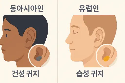- 동아시아인의 약 95%는 회색빛의 건성 귀지를, 유럽계 및 아프리카계 인구는 끈적하고 진한 습성 귀지를 가집니다.