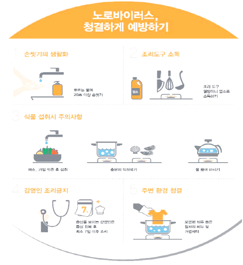 음식을 준비할 때 해산물, 특히 조개류를 적절한 온도로 조리하여 바이러스를 죽이는 것이 중요합니다. 과일과 야채는 섭취하기 전에 철저히 씻어야 합니다. 노로바이러스 증상을 보이는 사람, 특히 위장 장애가 있는 사람은 증상이 사라진 후 최소 48시간이 될 때까지 다른 사람을 위해 음식을 준비하는 것을 피해야 합니다.