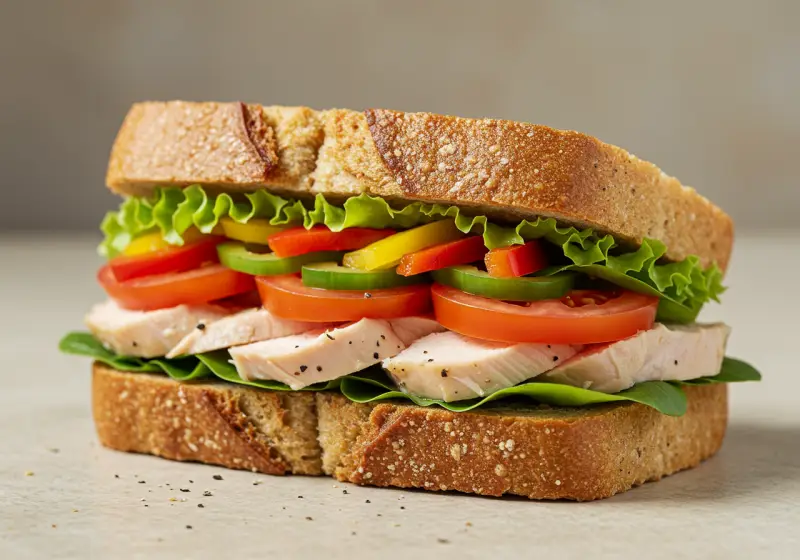 점심에는 닭가슴살을 얇게 썰어 통밀빵 사이에 넣고, 방울토마토, 상추, 오이 등 신선한 채소를 함께 넣어 샌드위치로 만들어보세요. 견과류를 잘게 부숴 샌드위치에 살짝 뿌리면 고소함과 영양이 더해집니다.