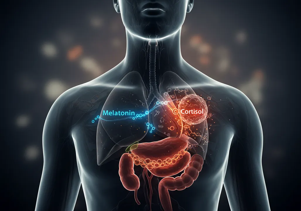 야식증후군은 멜라토닌 부족과 코르티솔 증가로 인해 생체 리듬이 깨지면서 발생할 수 있습니다. 멜라토닌은 수면을 유도하는 호르몬이며, 코르티솔은 스트레스와 관련된 호르몬입니다. 야식증후군 환자는 밤에 코르티솔이 증가하면서 스트레스를 해소하기 위해 음식을 찾는 경향이 있습니다.
