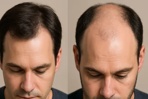 - 남성형: M자형 이마, 정수리 탈모 진행