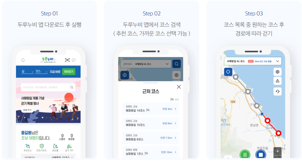 긴 구간들을 한 번에 돌 필요 없이 두루누비 앱을 설치하고 코스를 확인하여 자신의 체력에 맞는 알맞은 거리와 난이도를 선택해서 이용해 보시기 바랍니다. 앱로그인 후 따라가기 기능을 이용하면 안전하게 이동할 수 도 있습니다. 처음 가는 길이라 낯설고 헤매는 일을 줄여주는 기능입니다.