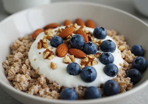 요거트에 삶은 귀리와 견과류, 블루베리를 섞으면 당은 줄이고 식이섬유와 항산화 성분을 높인 슈퍼 아침식사가 됩니다.