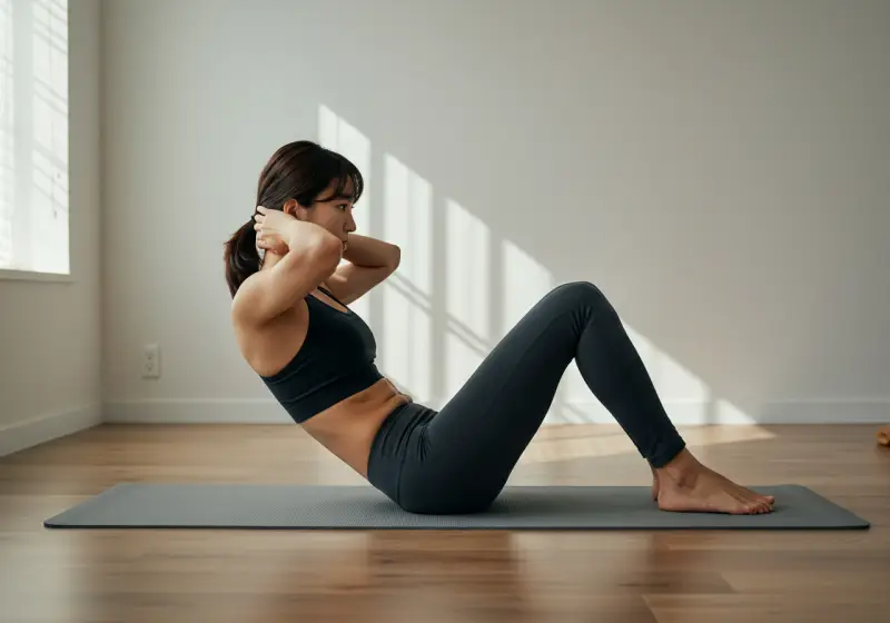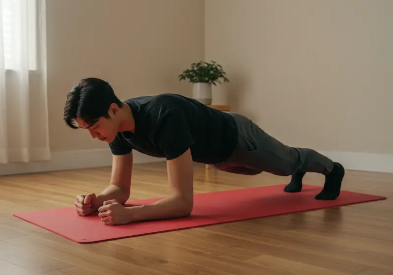 목 돌리기, 팔 돌리기, 허리 좌우 비틀기, 무릎 돌리기, 발목 회전으로 근육의 긴장을 풀고 관절 가동성을 높입니다. 동작은 천천히, 깊은 호흡과 함께 진행합니다. - 복근 운동 (15분)