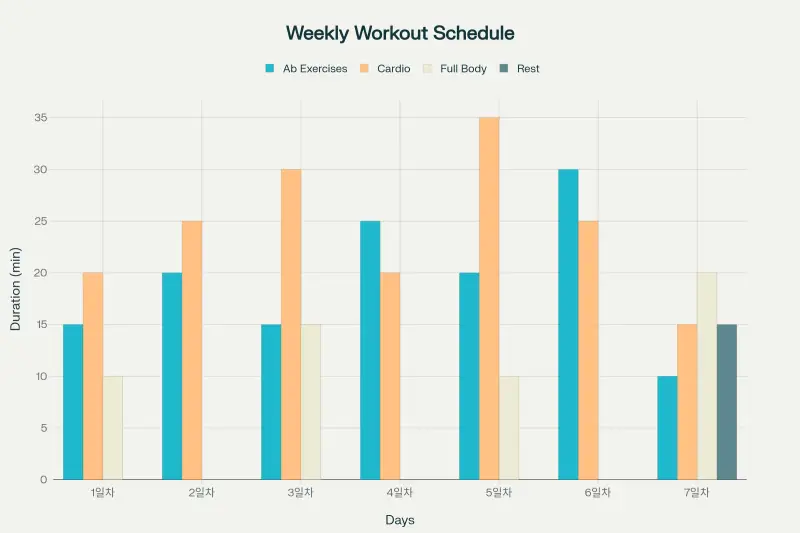 요일 복근운동 (분) 유산소 (분) 전신운동 (분) 총 소요시간 1일차 크런치, 플랭크 15분 빠른 걷기 20분 스쿼트, 푸쉬업 10분 45분 2일차 레그레이즈, 사이드 플랭크 20분 조깅 25분 없음 45분 3일차 시티드 니업, 러시안 트위스트 15분 사이클 30분 or 빠른 걷기 30분 버피 15분 60분 4일차 행잉 레그레이즈, 마운틴 클라이머 25분 HIIT 20분 없음 45분 5일차 데드버그, 바이시클 크런치 20분 수영 or 빠른 걷기 35분 런지, 덤벨 10분 65분 6일차 푸쉬업 플랭크, V업 30분 에어로빅/댄스 25분 없음 55분 7일차 플랭크 + 스트레칭 10분 걷기 15분 전신 스트레칭 20분 45분 숨은 팁: 4일차 HIIT는 타이머 앱을 활용해 40초 운동/20초 휴식 세트로 하면 효율이 극대화됩니다.