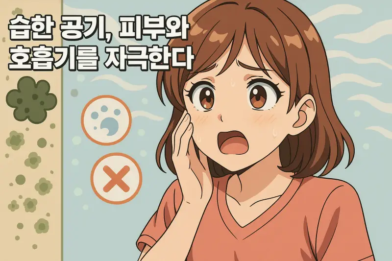 높은 습도는 피부의 pH를 불안정하게 만들고, 땀과 피지가 증발하지 못해 곰팡이성 피부 질환, 땀띠, 발진을 유발합니다. 동시에 호흡기에서는 진드기와 곰팡이, VOC(휘발성유기화합물)가 증가하여 천식, 두통, 집중력 저하 등을 유발할 수 있습니다. 특히 실내 환기가 부족할 경우 이 모든 악영향이 강화됩니다.