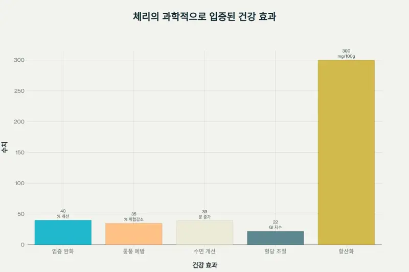 일반적인 과일들이 GI(혈당지수) 50~70대를 기록하는 것에 비해, 체리는 22라는 극히 낮은 수치를 기록합니다. 이는 당뇨 환자에게도 체리를 안전하게 섭취할 수 있게 만들어주는 과학적 근거입니다.