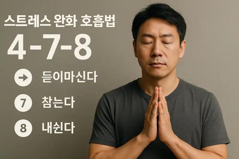 스트레스가 치솟을 때 4-7-8 호흡(4초 들숨·7초 멈춤·8초 날숨) 4회만으로도 심박과 긴장이 내려가 간식 탐닉을 끊어냅니다.